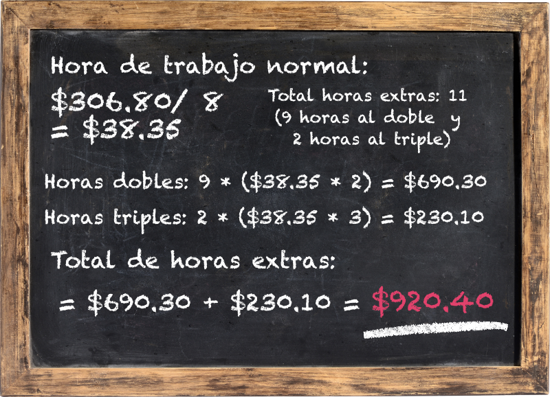 2. Por exceso de trabajo, un empleado laboró horas extras esta semana: tres el lunes, dos el miércoles y tres el viernes. Si su salario diario es de $306.80, ¿cuánto percibirá por estas horas?