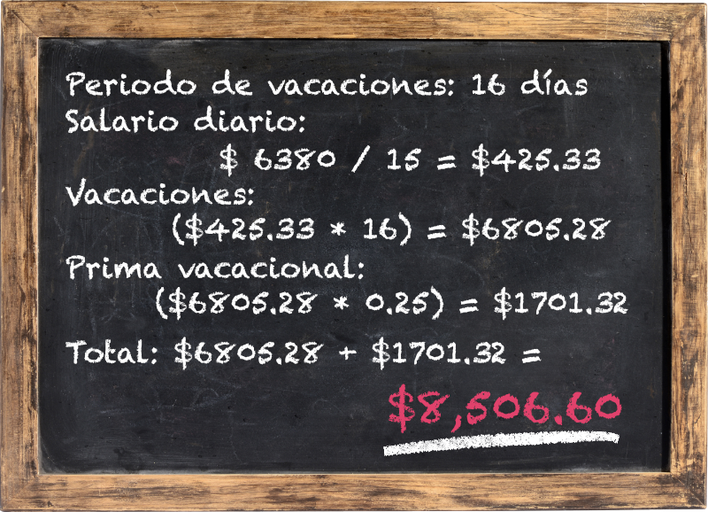 1. Determinar el periodo de vacaciones, así como el pago y la prima vacacional correspondientes, de un trabajador que cumple 14 años de servicio y que tiene un salario quincenal de $6380.00.