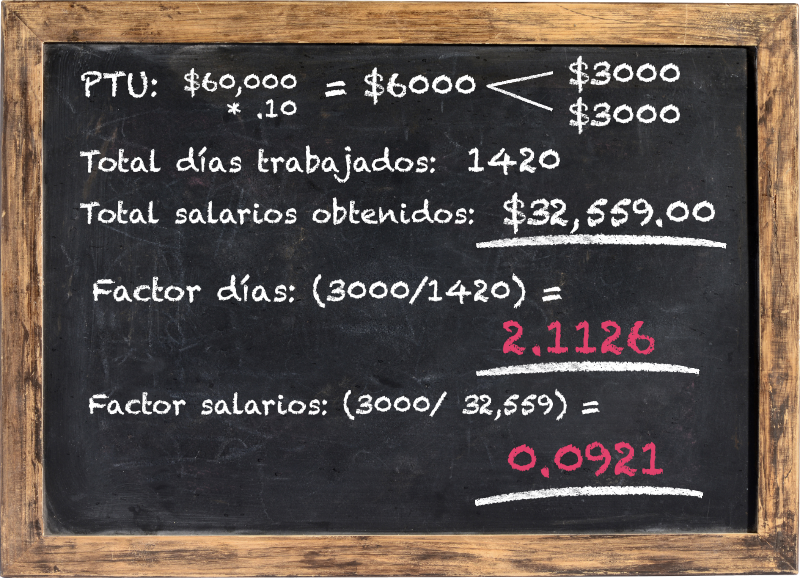 El 10 % de la renta gravable se divide en dos para obtener el factor días y el factor salarios; después el factor días se divide por el total de días trabajados por los empleados y el factor salario se divide por el total de salarios obtenido por los días trabajados.