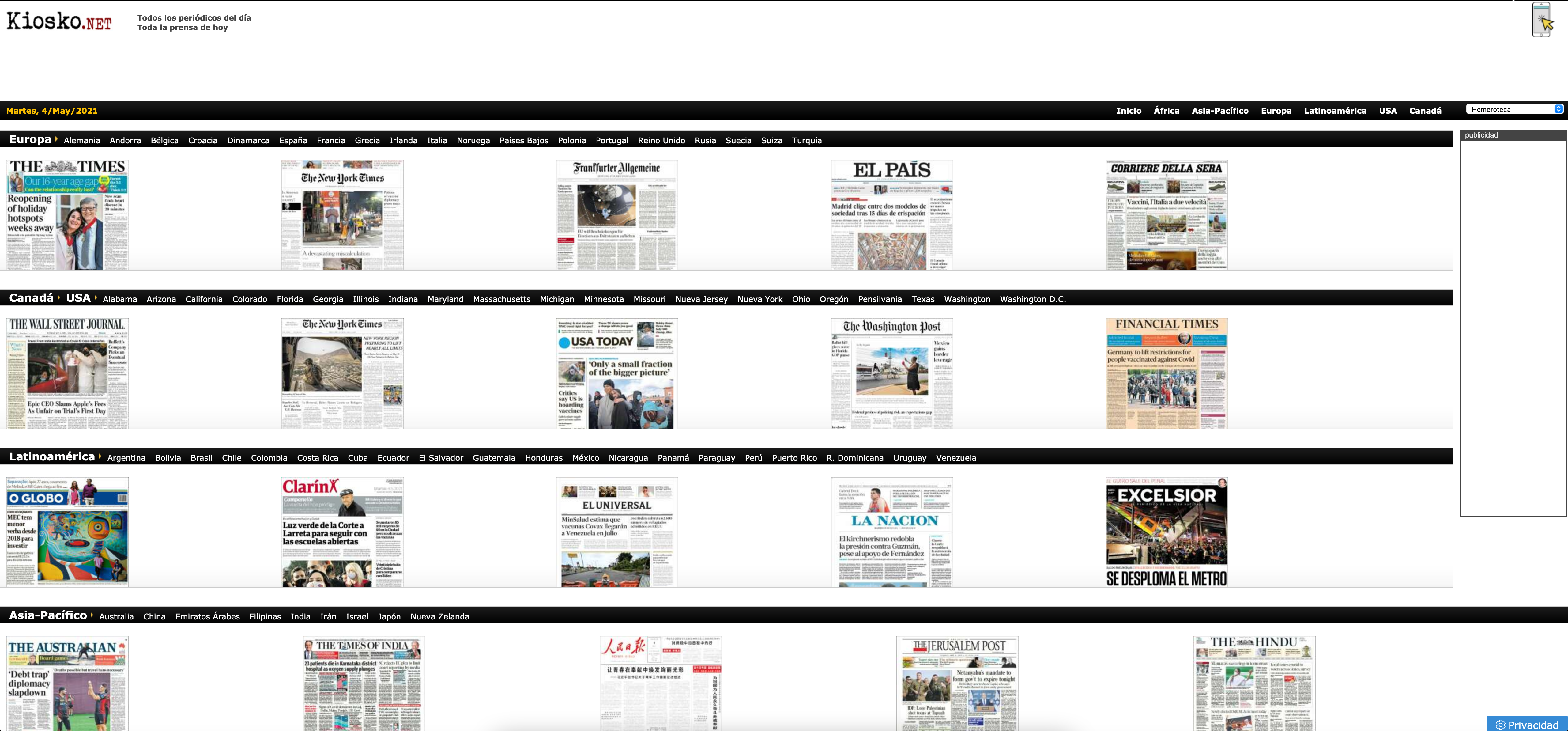 Kiosko.net: http://kiosko.net/ Ofrece una variada selección de periódicos de todo el mundo. Puedes elegirlos por continente o por país. Solo se pueden hacer búsquedas en los 7 días más recientes. De cada periódico, Kiosko.net te ofrece la primera plana y una selección de las últimas noticias publicadas en este. |