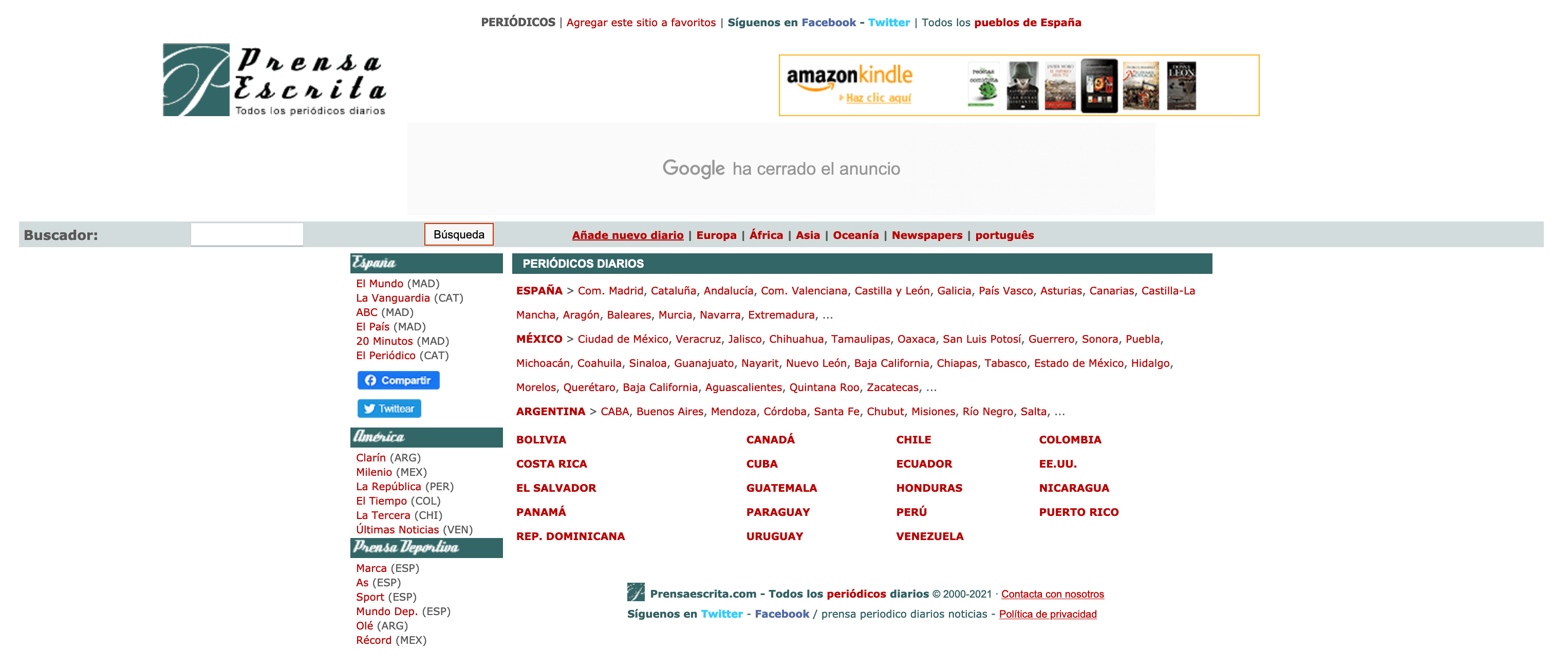 Prensa Escrita: https://www.prensaescrita.com/ Ofrece un directorio que incluye vínculos a una variedad de diarios organizados por país y por regiones, abarcando casi todos los países de América Latina, así como España y EE. UU. |