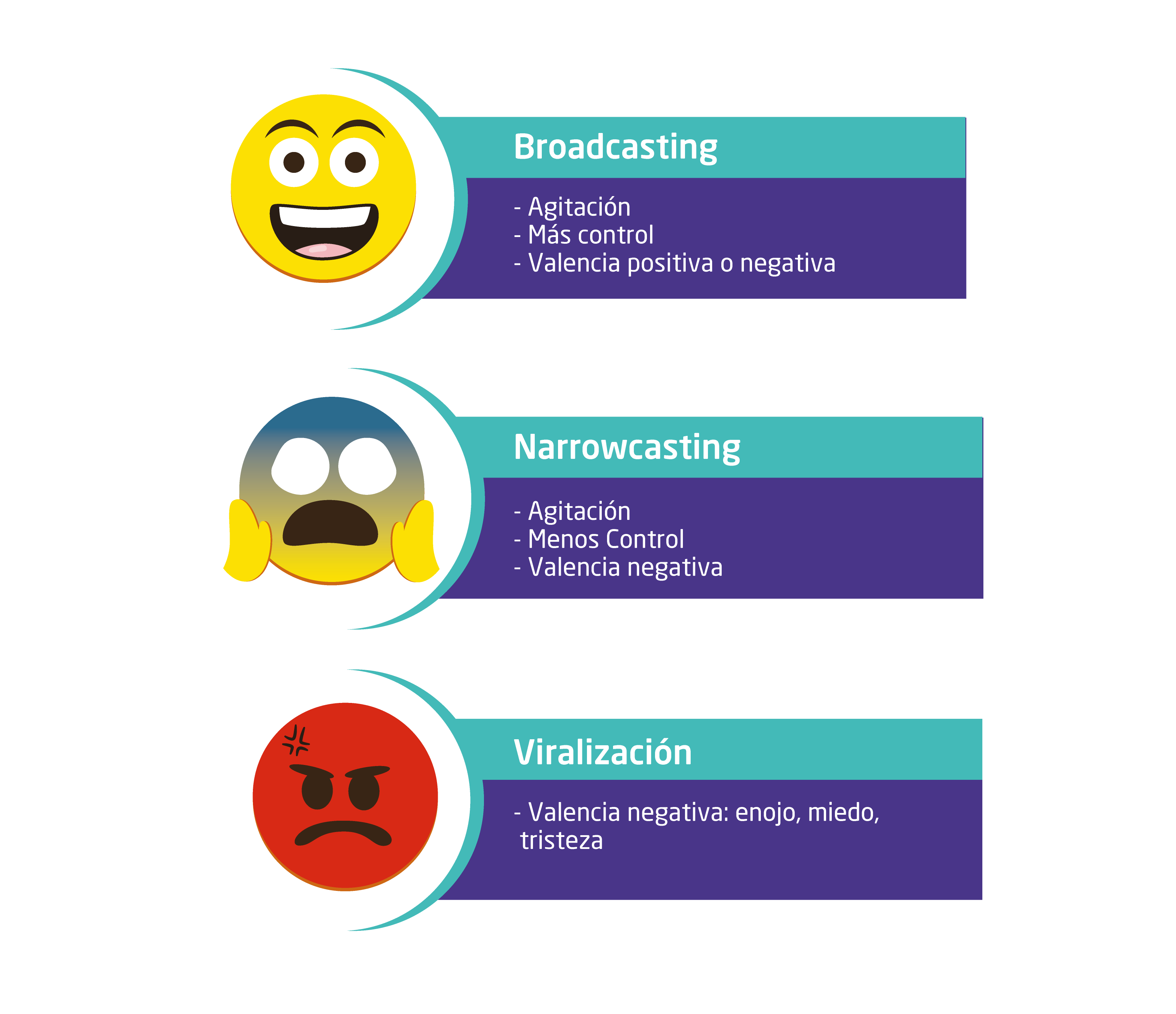 A partir del modelo VAD (Valence, Arousal y Dominance) que son las características de las emociones antes descritas (valencia, agitación y sentido de control), los autores identificaron que las personas son más proclives a compartir ampliamente (broadcast) contenido que las agita positiva o negativamente, pero que las hace sentir en control (sorpresa, alegría, inspiración). En tanto el narrowcasting (compartir en forma selectiva) corresponde a contenido que las agita, pero las hace sentir menos en control (enojo, miedo, tristeza). Un resultado que se repitió en general es que el contenido con valencia negativa es más viral que el contenido con valencia positiva, a pesar de que a menudo fluye en bloques más compactos mediante el narrowcasting.