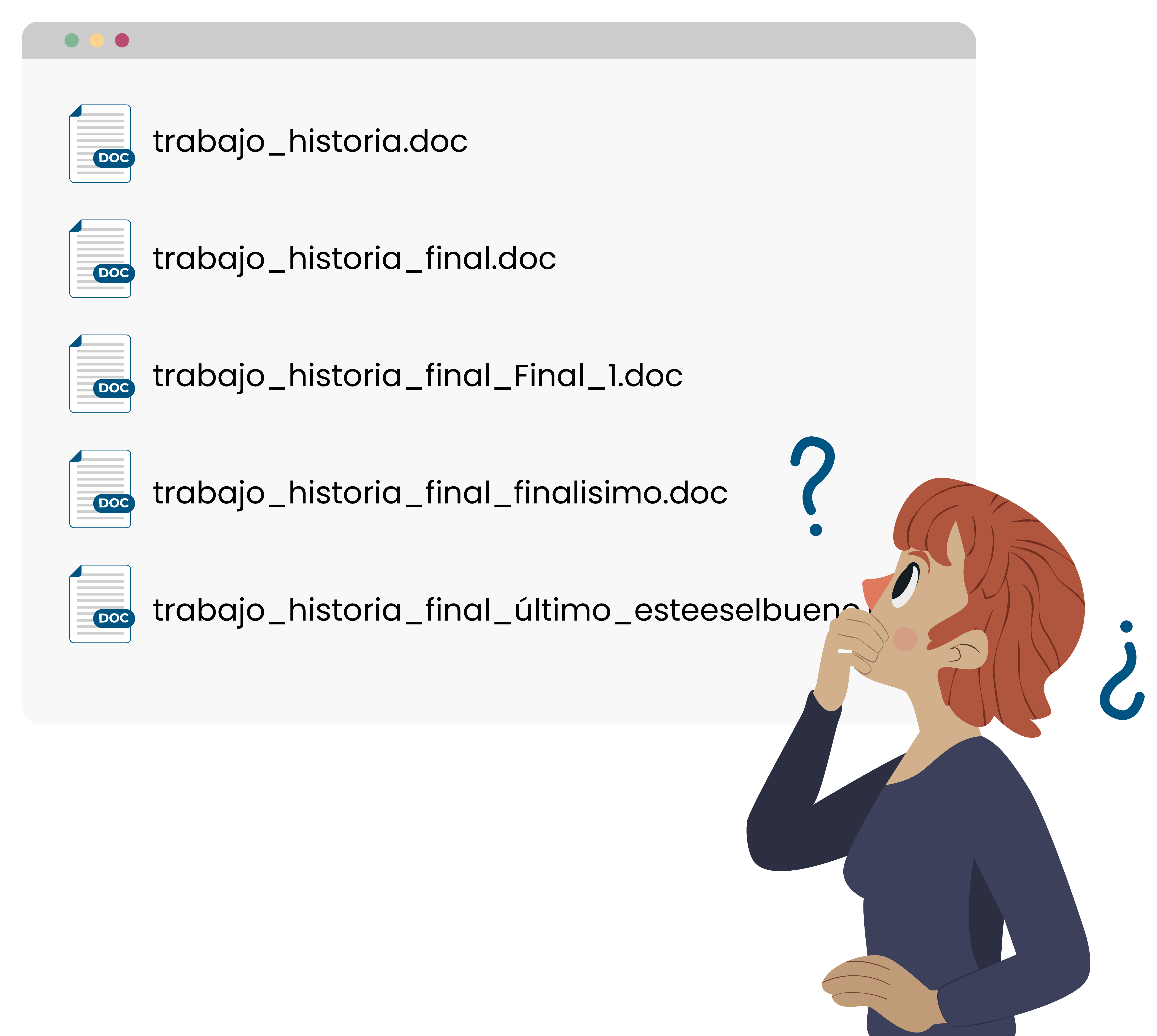 Por lo general, los sistemas operativos organizan automáticamente los archivos que guardamos en una carpeta por orden alfabético o por número, si el nombre del archivo incluye numeración. En este sentido, la recomendación que te hacemos es que, al interior de cada una de tus carpetas, sin importar la estructura que hayas decidido para ellas (por contexto, por tema, por tipo de archivo), organices tus archivos por fecha de creación y/o de última modificación. De esta manera, se ordenarán de manera cronológica y podrás encontrar fácilmente el último archivo en el que has estado trabajando.