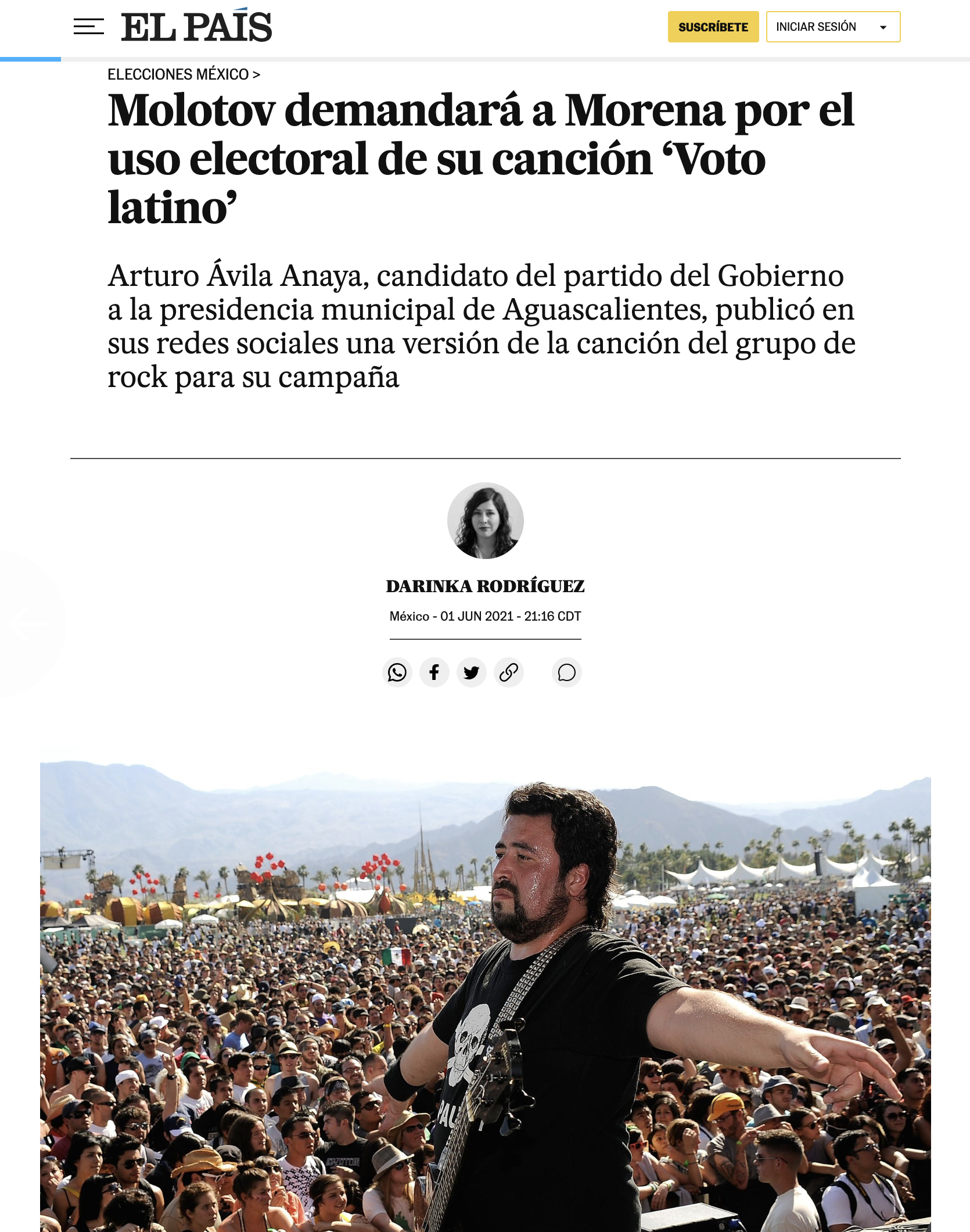 Otro ejemplo es el caso de Molotov que demandará a Morena por el uso sin consentimiento de su canción ‘Voto latino’ para su campaña.
